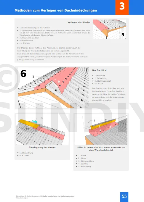 Konkrete Informationen für Ihr Projekt. Alle Geheimnisse, alle Tipps und Tricks für eine erfolgreiche Verlegung Ihrer Dacheindeckungen. Alle Techniken, alle Arten von Dacheindeckungen werden objektiv und unabhängig beschrieben. Detaillierte Ansichten beschreiben alle Schritte des Verlegens.