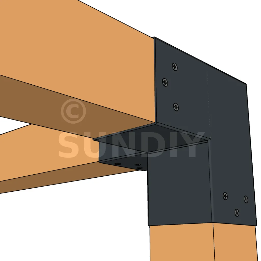 Es wird in einer Außenecke verwendet. Mit diesem Verbinder können Sie einen 90 x 90 mm großen Balken senkrecht mit einem 90 x 90 mm großen Balken verbinden, wobei das Ganze von einem 90 x 90 mm großen vertikalen Pfosten getragen wird.