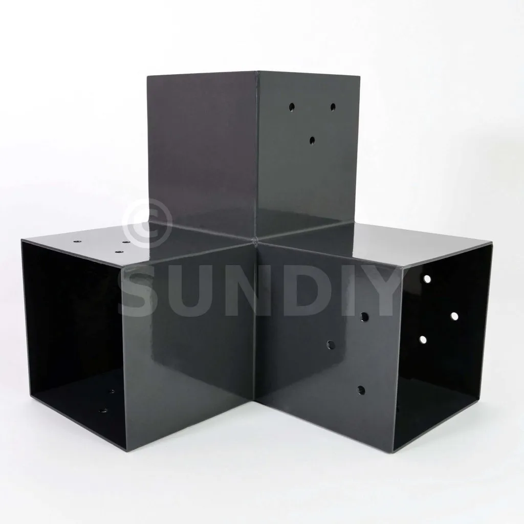 Es wird in einer Außenecke verwendet. Mit diesem Verbinder können Sie einen großen 120 x 120 mm großen Balken senkrecht mit einem 120 x 120 mm großen Balken verbinden, wobei das Ganze von einem 120 x 120 mm großen vertikalen Pfosten getragen wird.