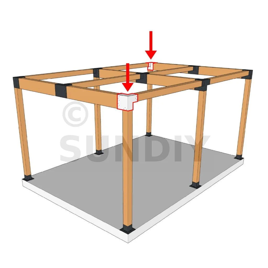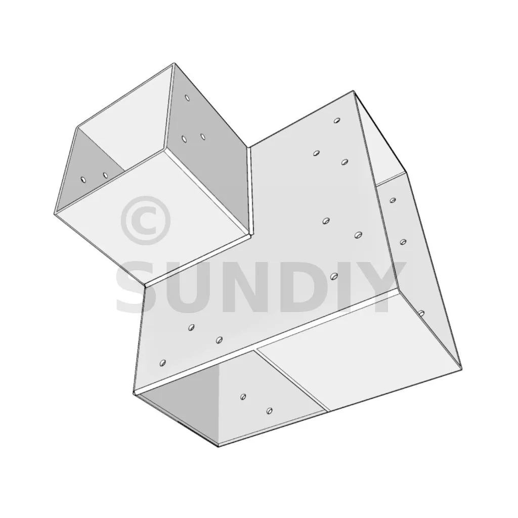 Es wird in einer Außenecke verwendet. Mit diesem Verbinder können Sie einen großen Balken von 240 x 120 mm senkrecht mit einem Balken von 120 x 120 mm verbinden, wobei das Ganze von einem vertikalen Pfosten von 120 x 120 mm getragen wird.