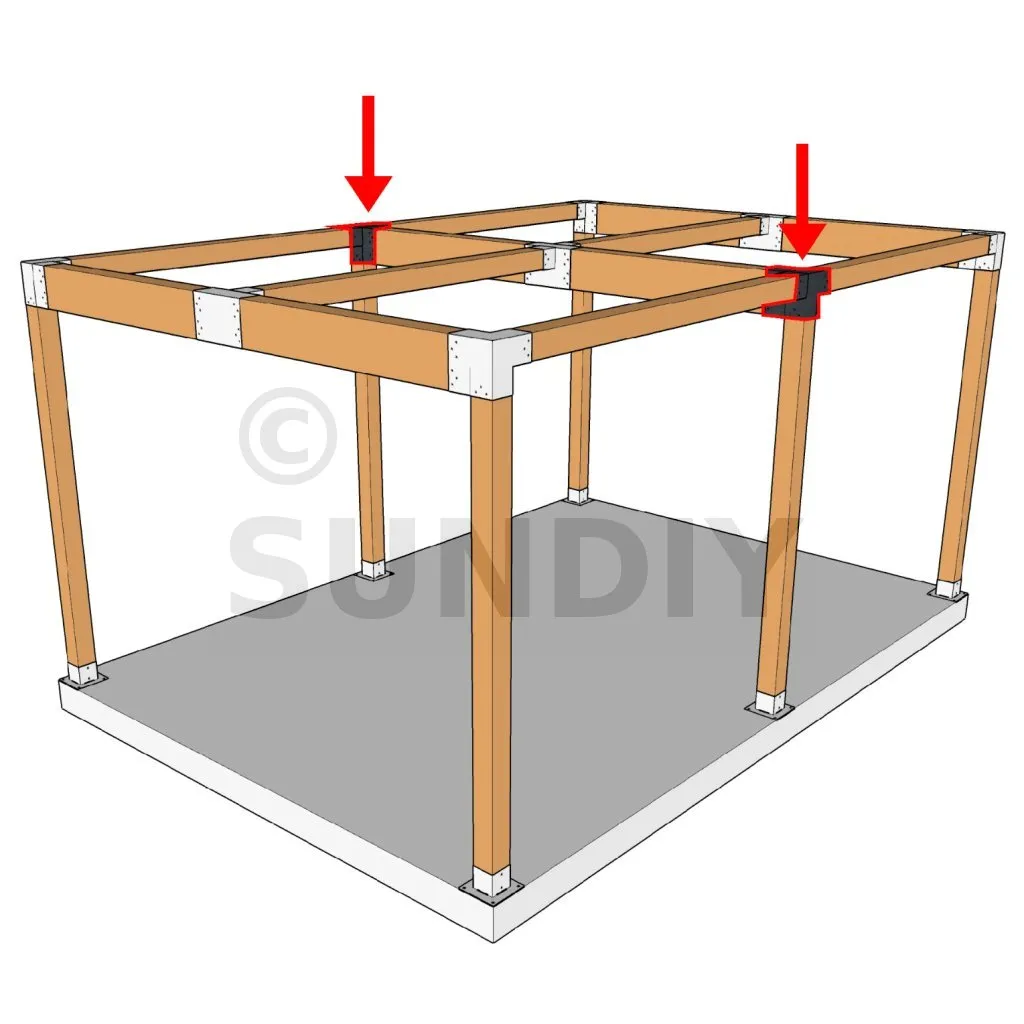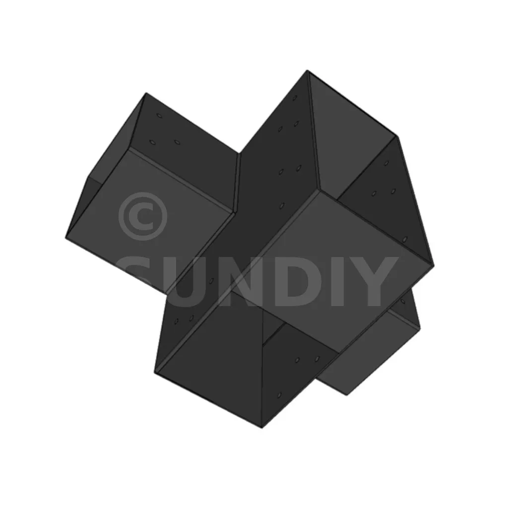 Es ermöglicht die senkrechte Verbindung von zwei 120 x 120 mm großen Balken zu einem großen 240 x 120 mm großen Balken, wobei das Ganze von einem 120 x 120 mm großen vertikalen Pfosten getragen wird.