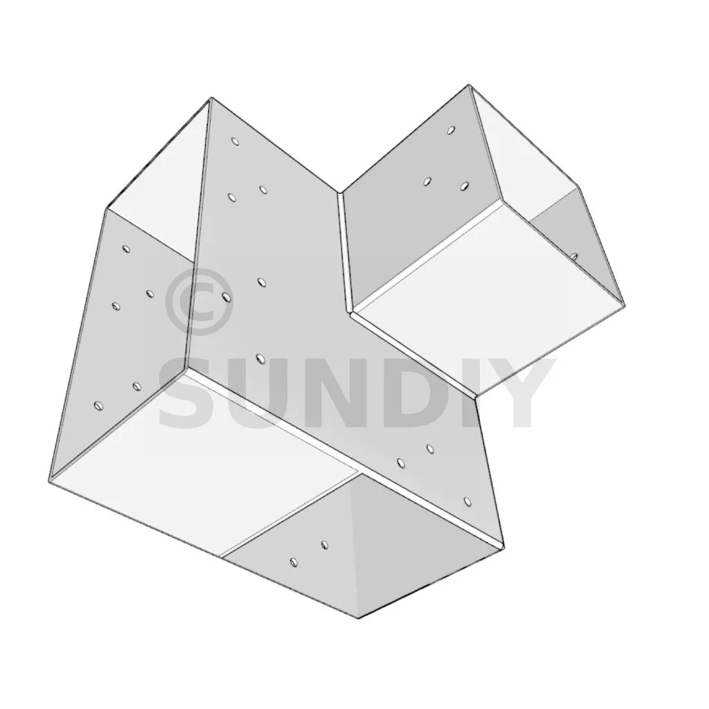 Es wird in einer Außenecke verwendet. Mit diesem Verbinder können Sie einen großen Balken von 240 x 120 mm senkrecht mit einem Balken von 120 x 120 mm verbinden, wobei das Ganze von einem vertikalen Pfosten von 120 x 120 mm getragen wird.