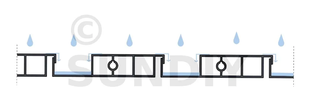 Dadurch wird das Wasser an beiden Enden gesammelt und nach außen umgeleitet.