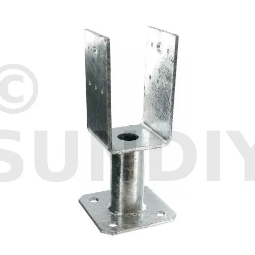 Dieser U-Pfostenträger mit Bodenplatte ermöglicht die Befestigung eines Pfostens auf einer Betonplatte und hält dabei Kräften in allen vier Richtungen stand.