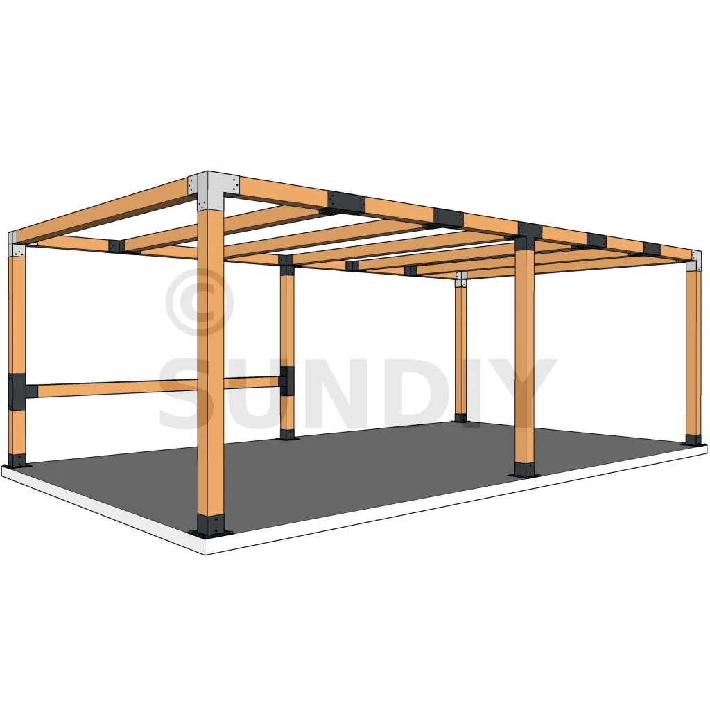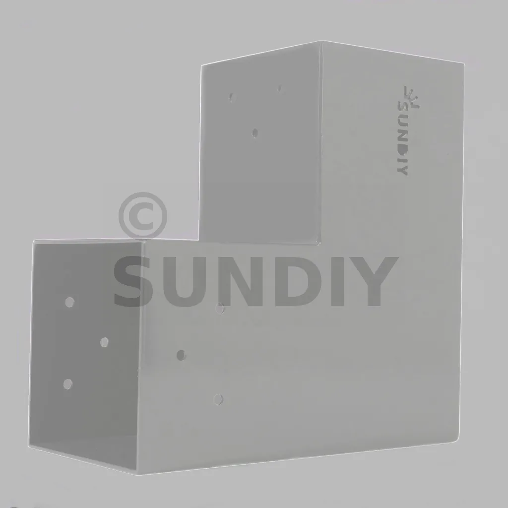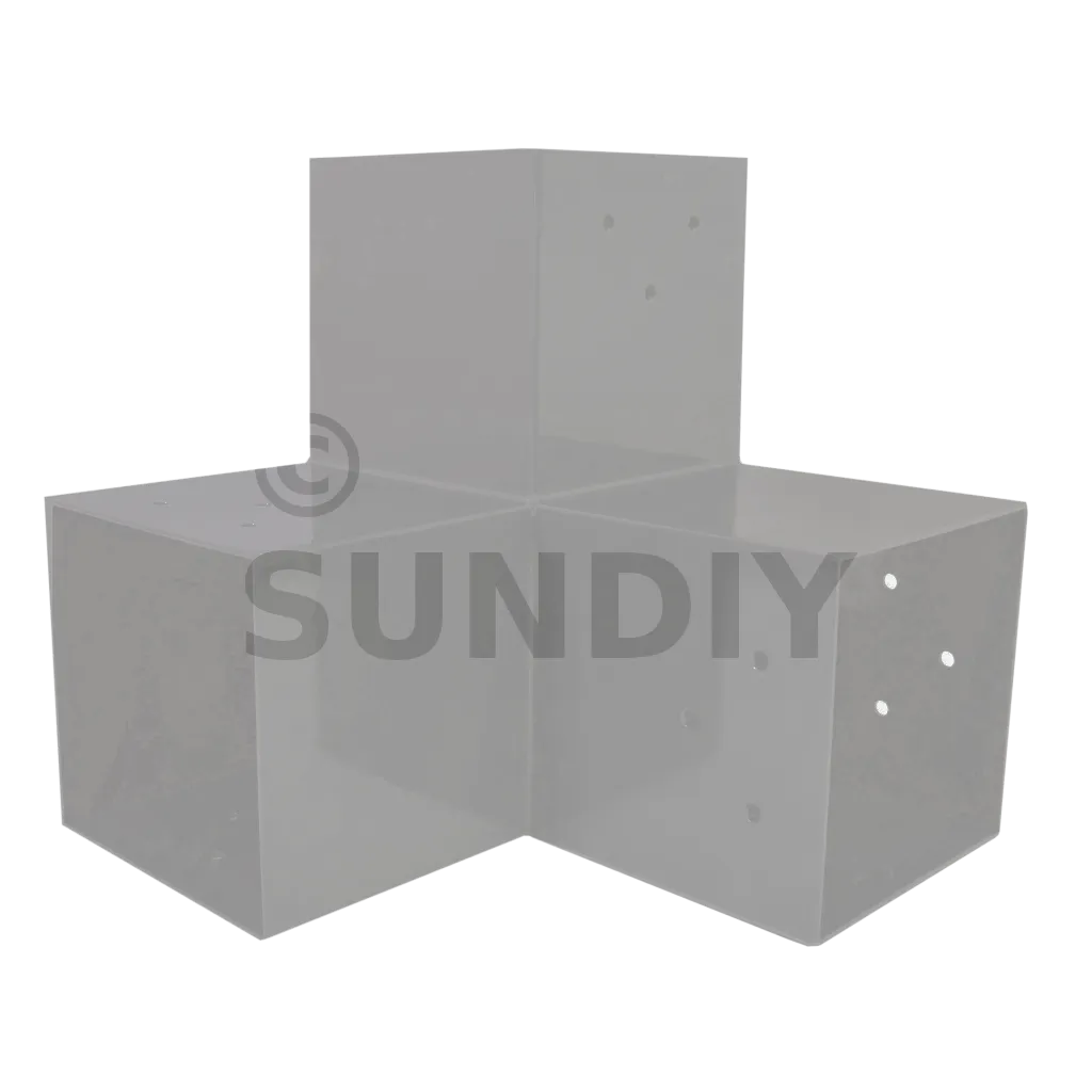 Es wird in einer Außenecke verwendet. Mit diesem Verbinder können Sie einen großen 120 x 120 mm großen Balken senkrecht mit einem 120 x 120 mm großen Balken verbinden, wobei das Ganze von einem 120 x 120 mm großen vertikalen Pfosten getragen wird.