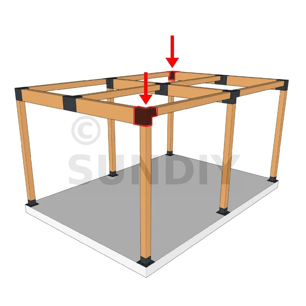 Es wird in einer Außenecke verwendet. Mit diesem Verbinder können Sie einen großen Balken von 240 x 120 mm senkrecht mit einem Balken von 120 x 120 mm verbinden, wobei das Ganze von einem vertikalen Pfosten von 120 x 120 mm getragen wird.