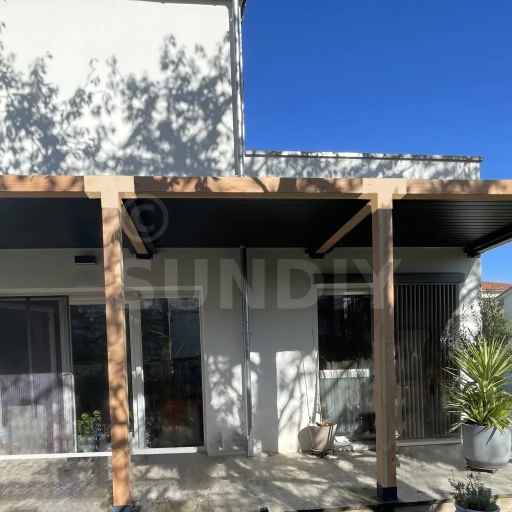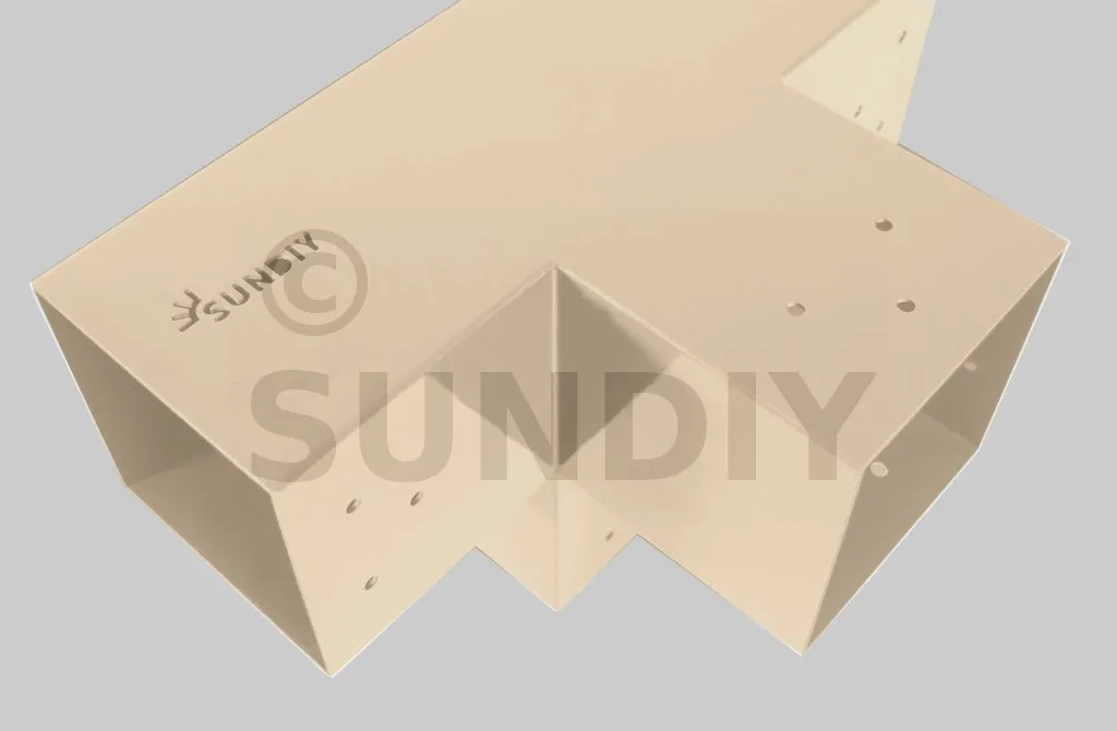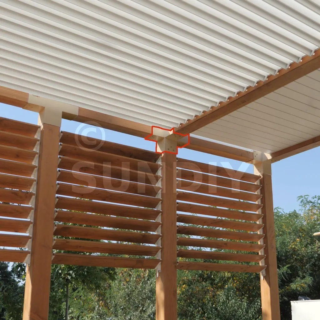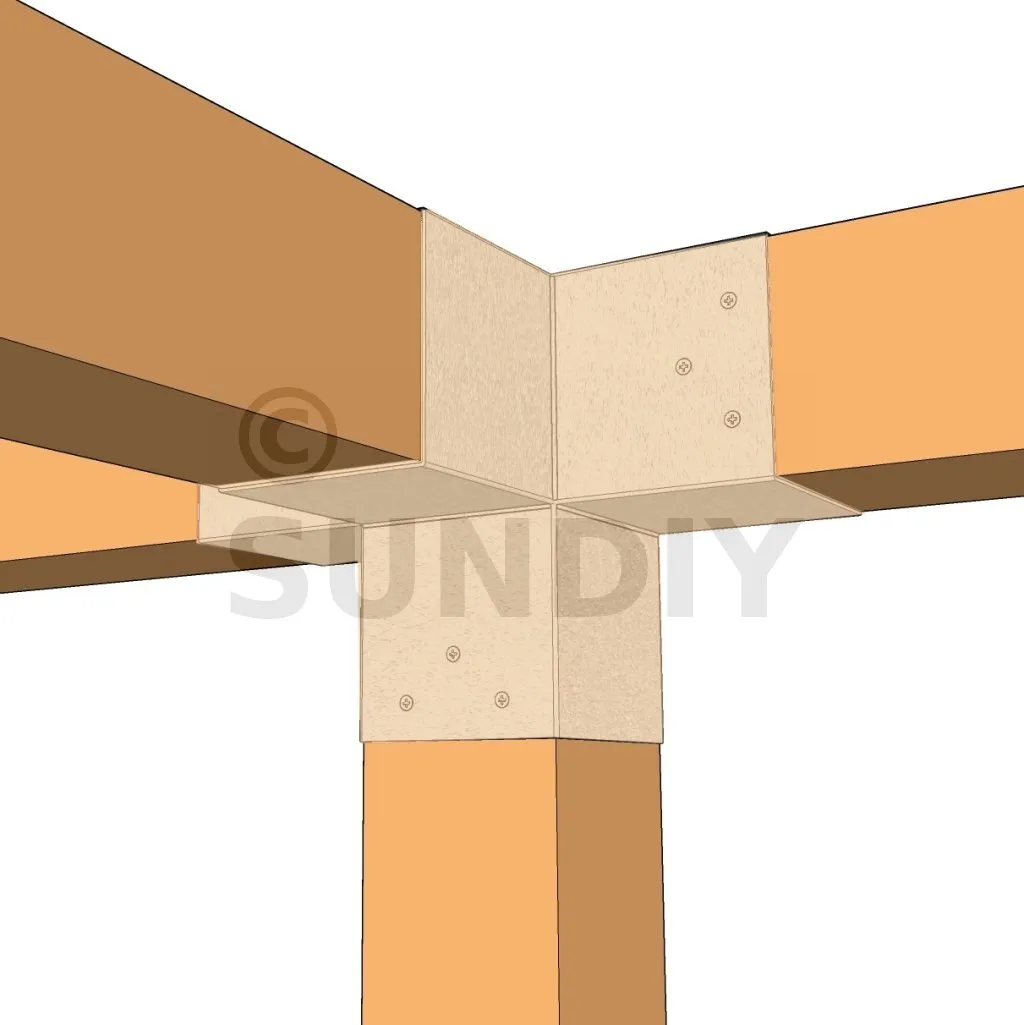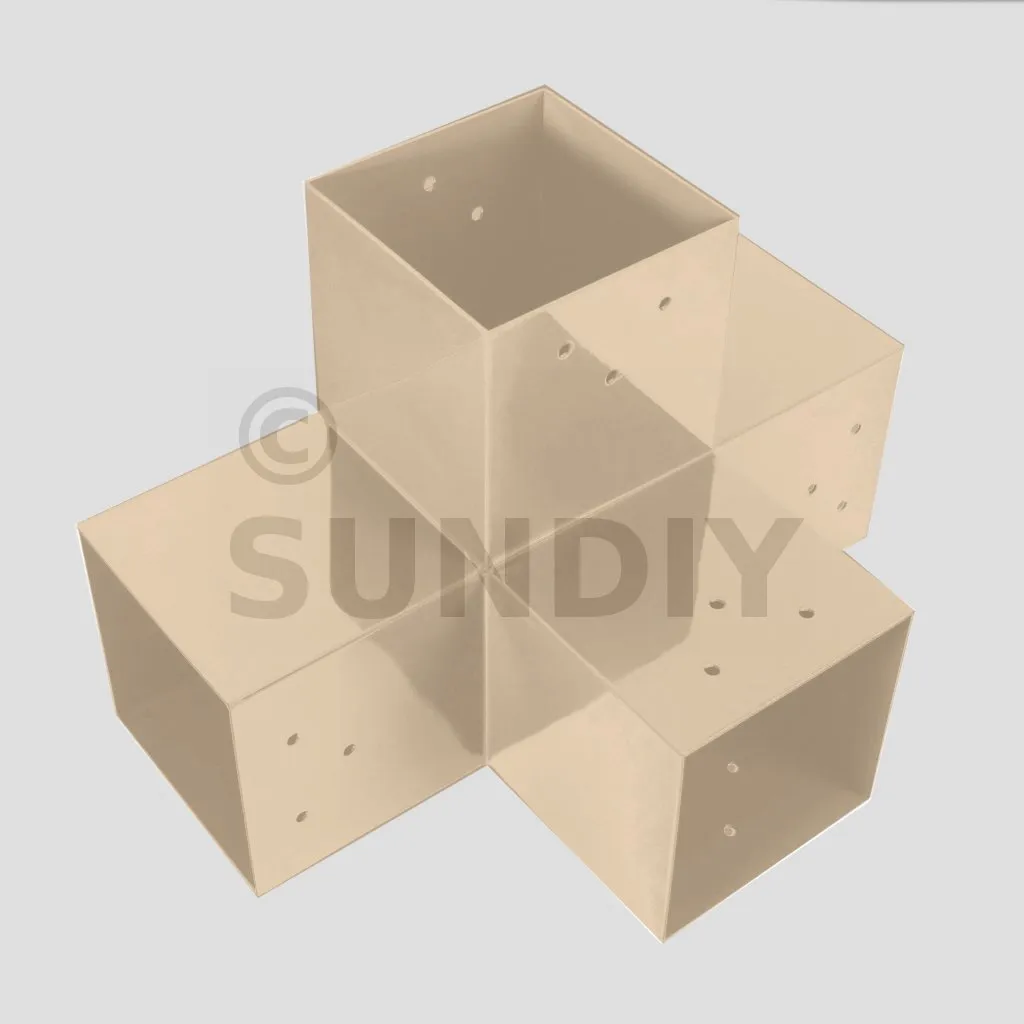 Damit kann eine 120x120mm-Stütze senkrecht zu einem 120x120mm-Chevron angebracht werden, die insgesamt von einem 120x120mm-Vertikaltopf unterstützt wird.