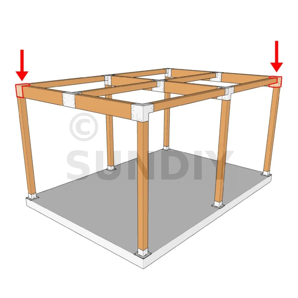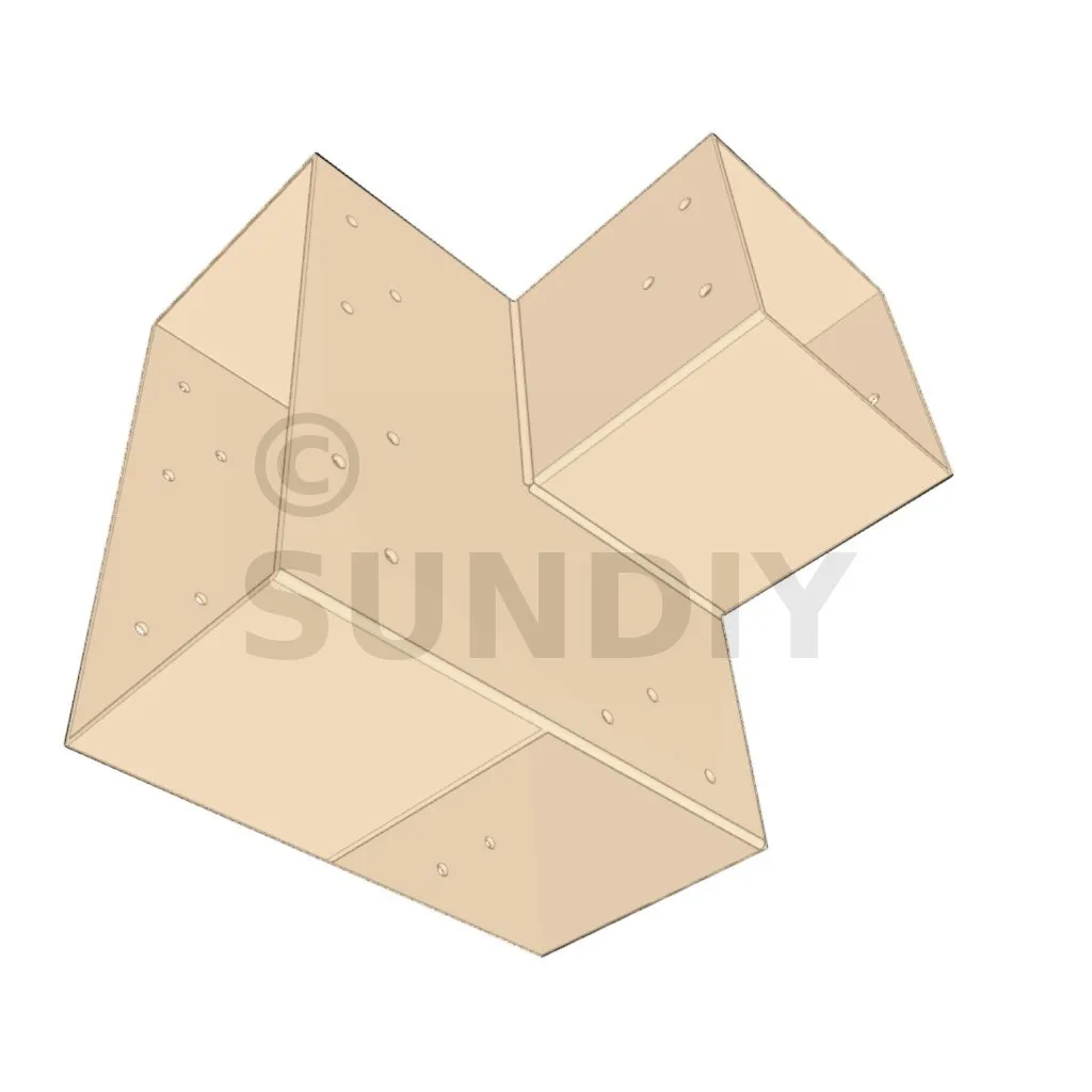 Es wird in einer Außenecke verwendet. Mit diesem Verbinder können Sie einen großen Balken von 240 x 120 mm senkrecht mit einem Balken von 120 x 120 mm verbinden, wobei das Ganze von einem vertikalen Pfosten von 120 x 120 mm getragen wird.