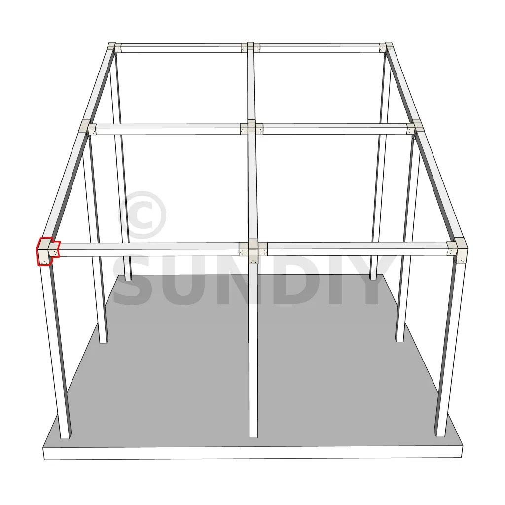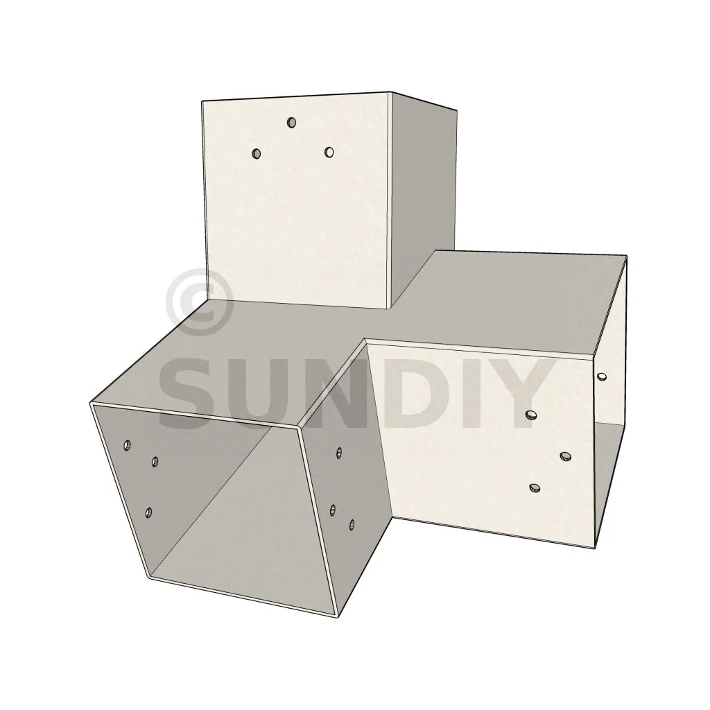 Er wird in einer äußeren Ecke verwendet. Der Verbinder verbindet einen 120×120 mm Balken mit einem weiteren 120×120 mm Balken mit einer Neigung von 20°, getragen von einem senkrechten 120×120 mm Pfosten.