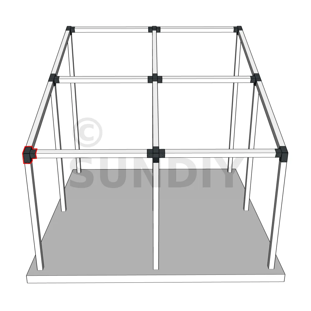 Er wird in einer äußeren Ecke verwendet. Der Verbinder verbindet einen 120×120 mm Balken mit einem weiteren 120×120 mm Balken mit einer Neigung von 20°, getragen von einem senkrechten 120×120 mm Pfosten.