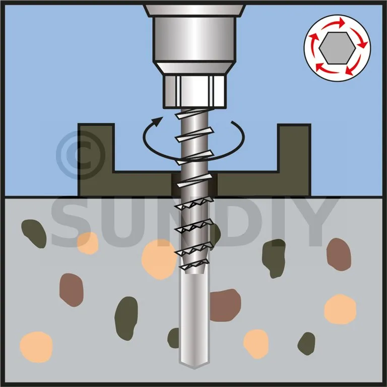 Die Sechskant-Betonschraube mit Fuß ist ein formschlüssiges Befestigungssystem für schwere Lasten in gerissenem und ungerissenem Beton. Es ermöglicht eine schnellere Installation als Standardanker für dauerhafte oder temporäre Anwendungen. Das Sägezahngewinde sorgt für einen sehr effizienten Halt.