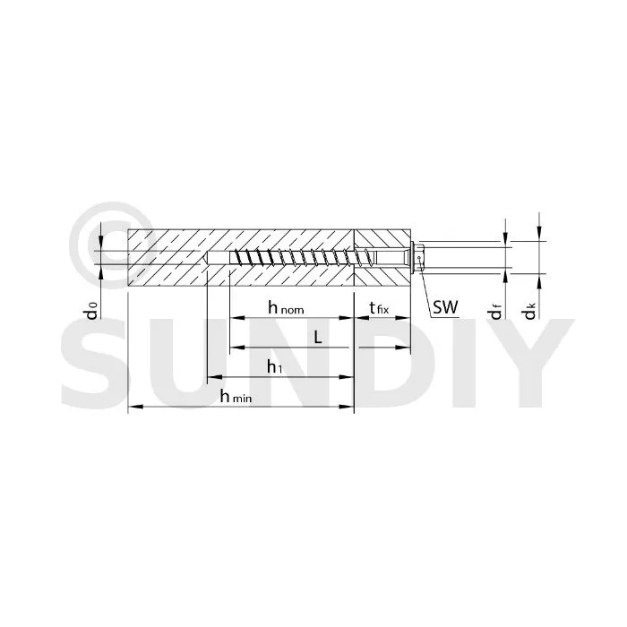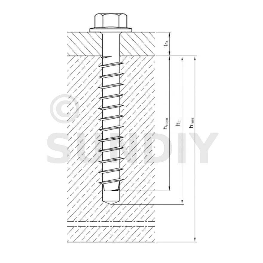 - Schraube zum Einsetzen ohne Dübel in ein vorgebohrtes Loch. Der Durchmesser des Bohrers zum Vorbohren ist im Merkmal „Nennbohrerdurchmesser, d0“ angegeben.