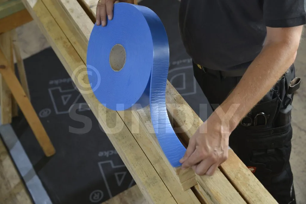 Aufnagelbares Dichtband mit einer selbstklebenden, geschlossenzelligen Polyethylenschaum-Oberfläche in Kombination mit einer integrierten Silikonfolie. Verbessert die Abdichtung zwischen DELTA® -Bahnen an den Perforationen, die durch die Befestigung der Konterlatten und Latten entstehen (kein Sickerphänomen).