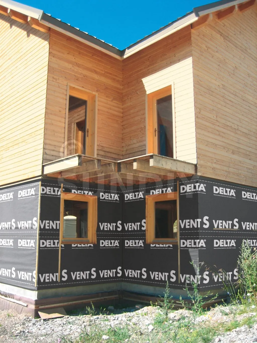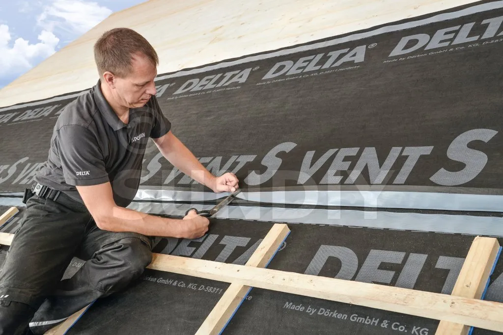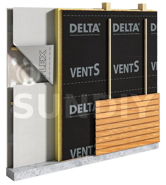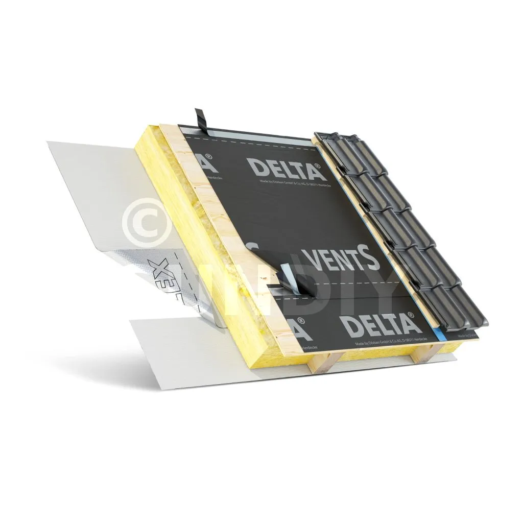 Ausführung ohne selbstklebende Kanten : DELTA®-VENT S. Dämmung im Kontakt mit dem durchgehenden Untergrund : auf der Innenseite, Dampfsperre von Wert
