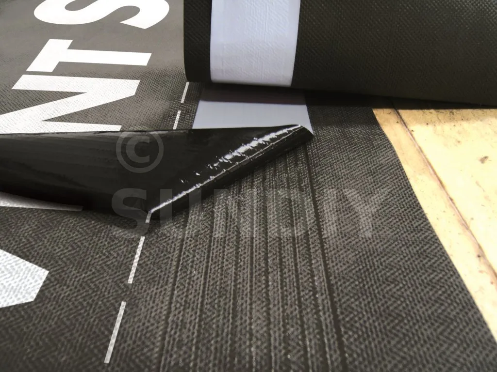 - MaterialPP-Lagen-Dachunterspannbahn, bestehend aus zwei desorientierten Endlos-Monofilament-Vliesstoffen und einer atmungsaktiven Folie.