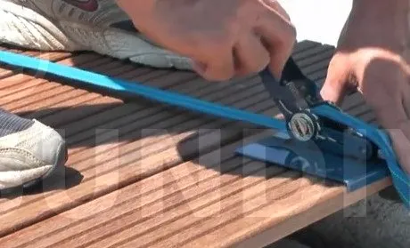 Erleichtert die Montage der Dielen, ermöglicht das Richten von verformten Dielen. Gebogene Kante für einen festen Halt, Präzisions-Zahnstangenmechanismus, 5 m langer, nicht verformbarer Polypropylen-Flansch. Spanndruck von 100 kg