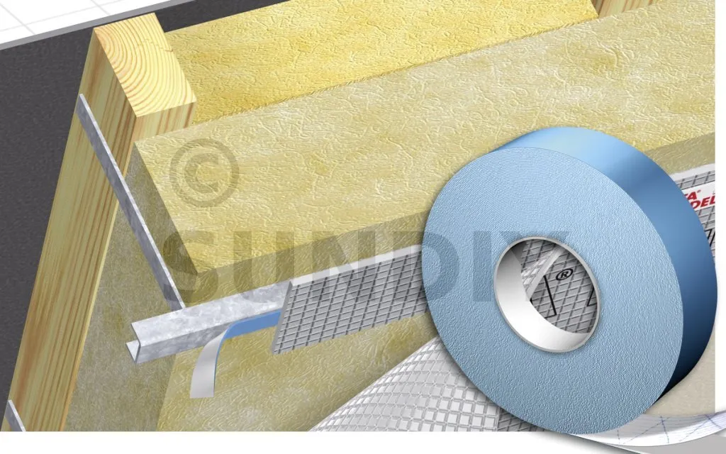 Doppelseitiges verstärktes Klebeband mit Abziehfolie auf der Unterseite zur temporären Befestigung der Dampfsperre am Metallprofil, das die Gipskartonplatte trägt.