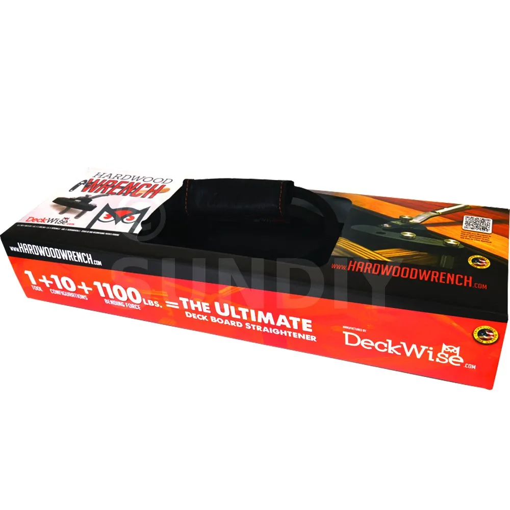 Die 2010 in den USA patentierte Deckwise-Brettrichtmaschine ist das perfekte Werkzeug für die Installation durch eine Person und bietet viele Vorteile gegenüber anderen Bandrichtmaschinen. Eine einfache Drehung des Werkzeuggriffs richtet die am stärksten verformten Dielen mit einer Biegekraft von 500 daN auf.