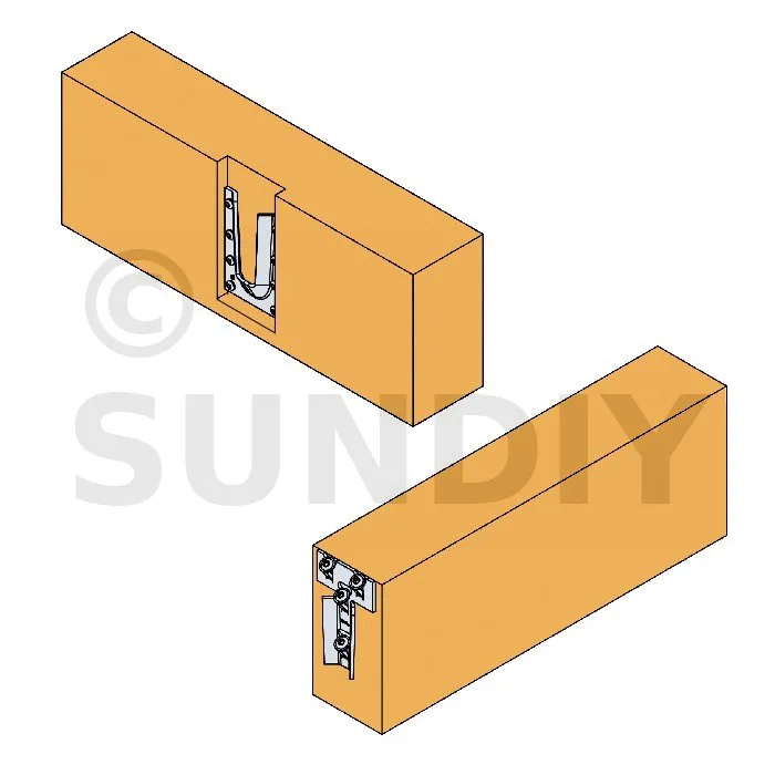 Der ETSN-Stahlpassverbinder ist ein innovativer und sehr diskreter Verbinder. Er ermöglicht es, die Ästhetik einer traditionellen Passverbinderverbindung nachzubilden. Der weibliche Teil wird mit CSA-Schrauben oder CNA-Nägeln auf dem Hauptträger platziert, während der männliche Teil mit Flachkopfschrauben am Ende des Nebenträgers befestigt wird.