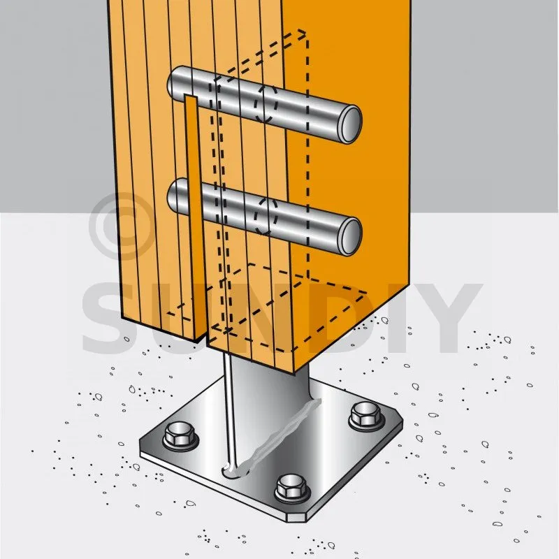 - Holzverbindung auf starrem TrägerAm Pfosten : 2 Edelstahldorne Ø12 oder Ø16 oder Edelstahlbolzen Ø12 mm oder 16 mm je nach Bohrung ; auf Beton : 4Ø12 (BOAX-II-Dübel M12-104/5 A4 ; Gewindestange M12) ; auf Stahl : Edelstahlbolzen Ø12
