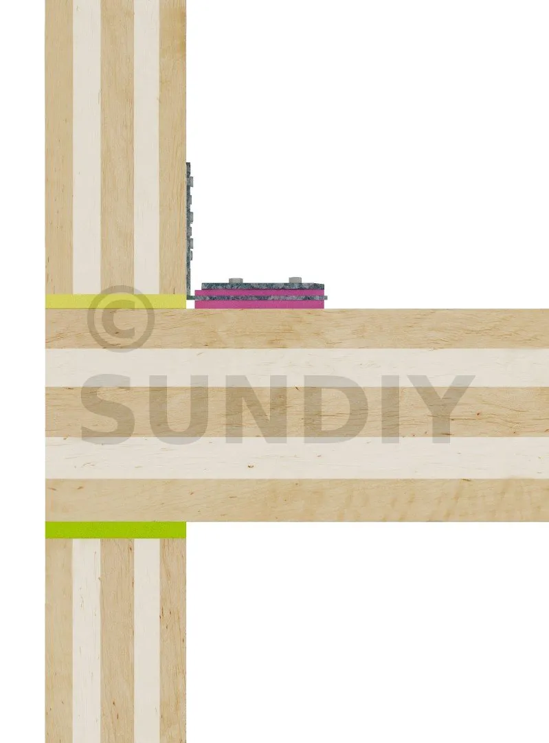 Der Schallschutzwinkel ABAI ist ein innovativer Bügel, weil er einen klassischen Winkelverbinder mit einem schalldämmenden Material, Sylodyn®, kombiniert. Er ermöglicht die Verbindung von Wand- und Bodenelementen aus Mehrschichtplatten (CLT) und garantiert gleichzeitig die Schalldämmung zwischen diesen Bauteilen dank eines 12 mm breiten Streifens aus Sylodyn®, der unter dem Winkel vorinstalliert ist.