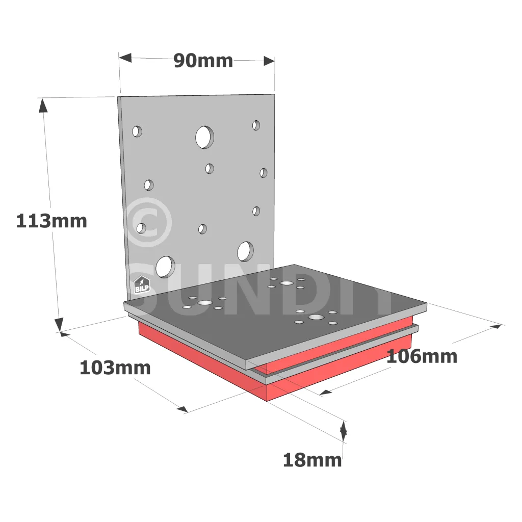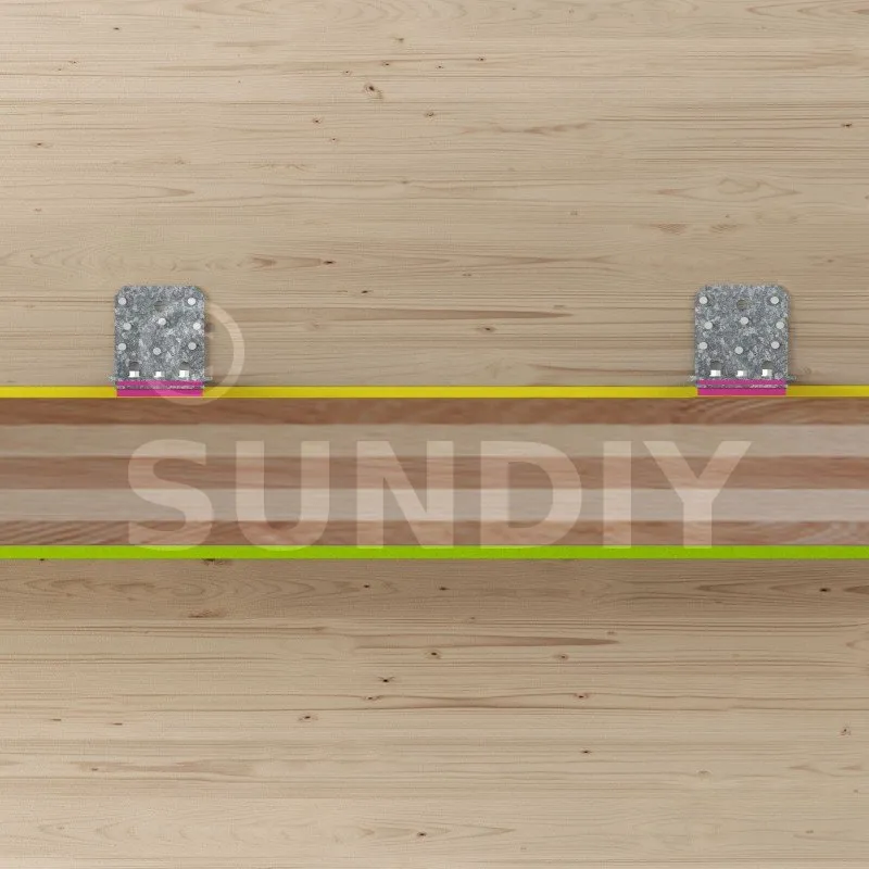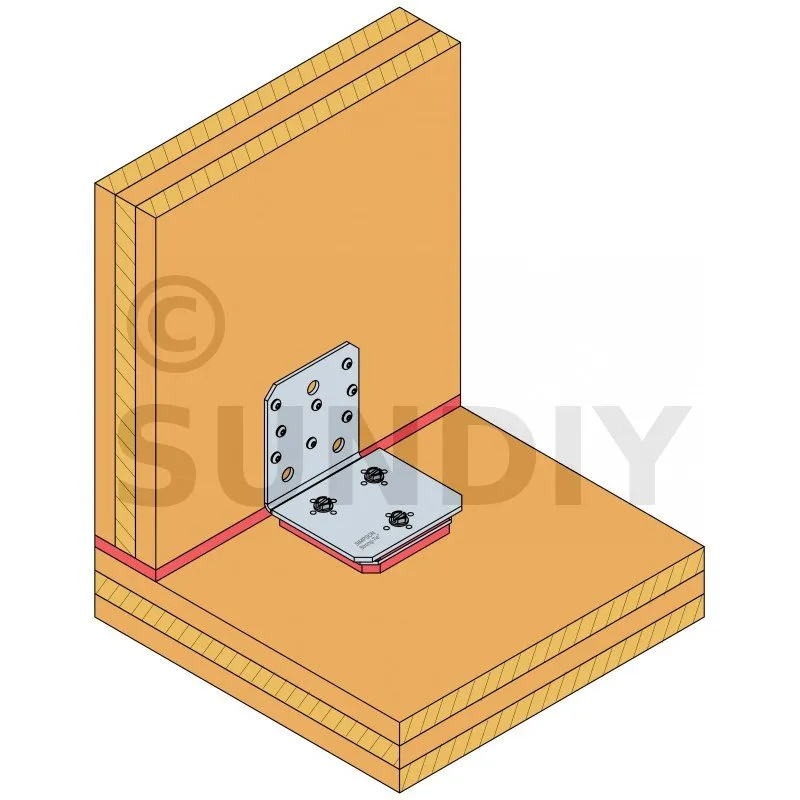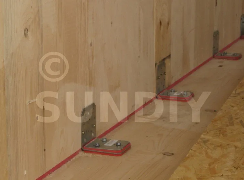 Für absolute Effizienz ist das Vorhandensein eines Sylodyn®-Streifens unter den CLT-Wandpaneelen zwingend erforderlich. Die Auswahl der Sylodyn® Streifen hängt vom Gewicht der Wand ab (siehe Tabelle unten). Zur besseren Montage des ABAI-Winkelverbinders ist eine Montageschablone (Ref. MOABAI) erhältlich. Sie verhindert das Zusammendrücken des Sylodyn®-Streifens unter dem Winkelverbinder.