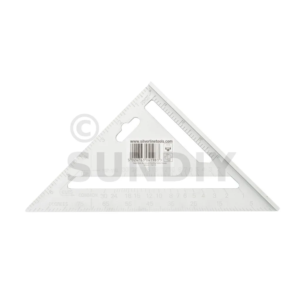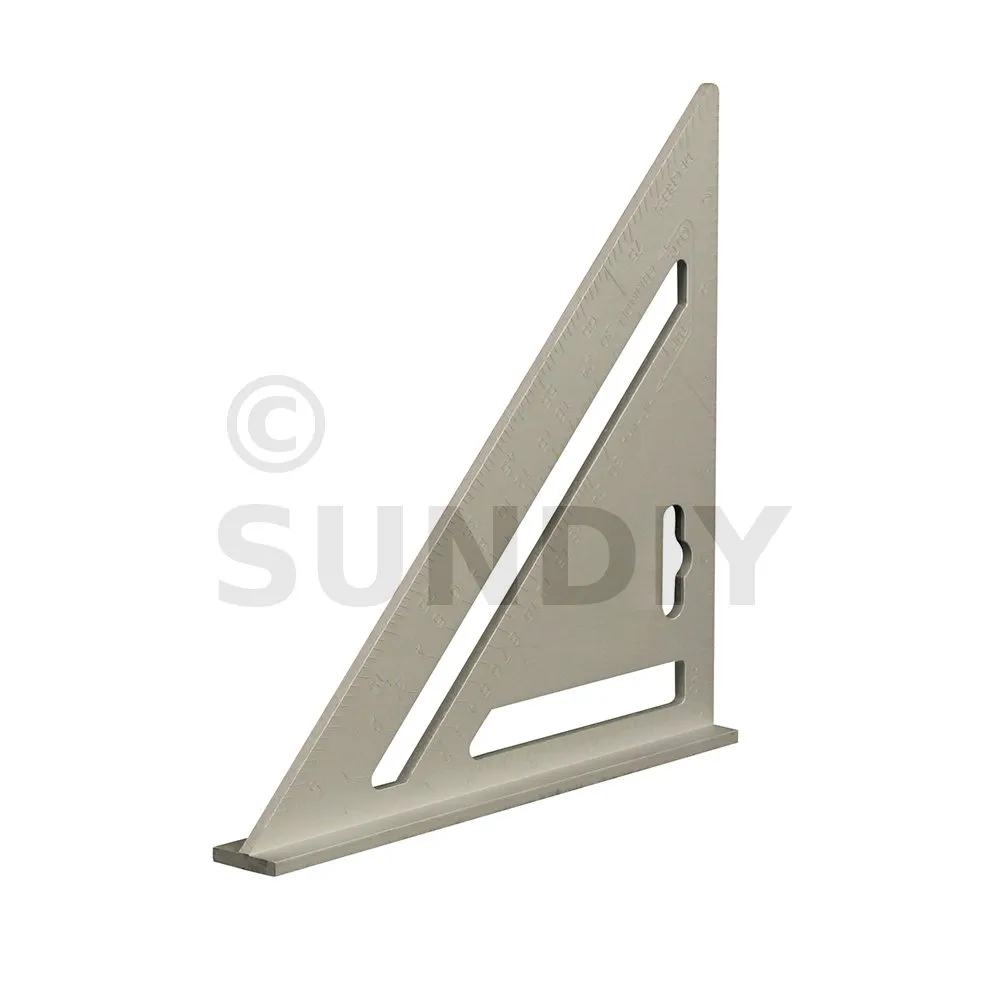 Hochbelastbarer Winkel aus Aluminiumgusslegierung, leicht ablesbare, erhabene imperiale Skalen und Umrechnungstabelle für die Sparrenmontage. Erhöhte Kanten für sicheren Stand. 0-90° Winkelmesserskala. Als Hilfsmittel beim Sägen für Winkelmessungen und Schnitte verwenden. Gewicht 125 g. Abmessungen : 185 x 185 x 260 mm.