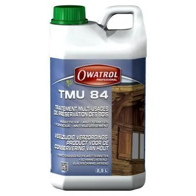 TMU 84 NG ist ein Insektizid und Fungizid, das leicht zu applizieren ist und eine hervorragende Tiefenwirkung hat. Seine Formel ist angereichert mit Anti-Termiten und Anti-Blauschleier im Einsatz. Es ist nicht fettend, farblos, geruchlos und nicht brennbar.