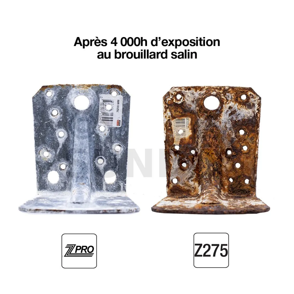 Tatsächlich bilden ZPRO®-Verbindungsstücke nach und nach eine dünne Schicht aus Zink und Magnesium auf dem entstehenden Rost, wenn sie mehrere Wochen lang klimatischen Bedingungen ausgesetzt werden. Diese als Weißrost bezeichnete Schicht fungiert als zusätzliche Barriere und schützt das Material vor aggressiverer Korrosion.