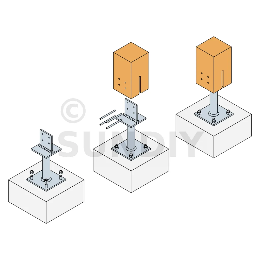 ** Beziehen Sie sich auf das Simpson Strong-Tie Verankerungssortiment, um die richtige Verankerung auszuwählen. Standardlösungen sind BOAXII, SET-XP, WA, AT-HP, die je nach Betonart, Achsabstand und Randabständen ausgewählt werden sollten.