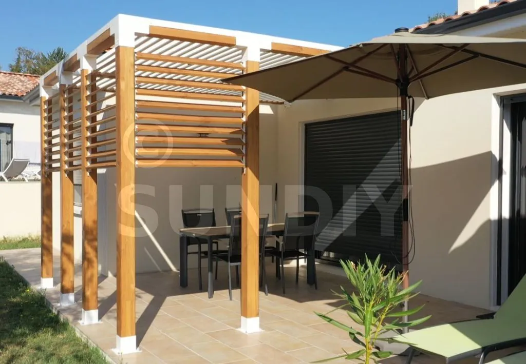 rançois hat eine Südterrassentür, die an Sommertagen zu einer Erhöhung der Temperatur in seinem Zuhause führt. Er hat sich entschieden, eine bioklimatische Pergola mit weißen Aluminiumlamellen und Sichtschutzwänden zu installieren, die seine Terrassentür vor der Sonne schützt. Dadurch kann die Wärme in seinem Haus reduziert werden, während gleichzeitig eine angenehme Helligkeit erhalten bleibt, selbst während der heißesten Perioden des Jahres !