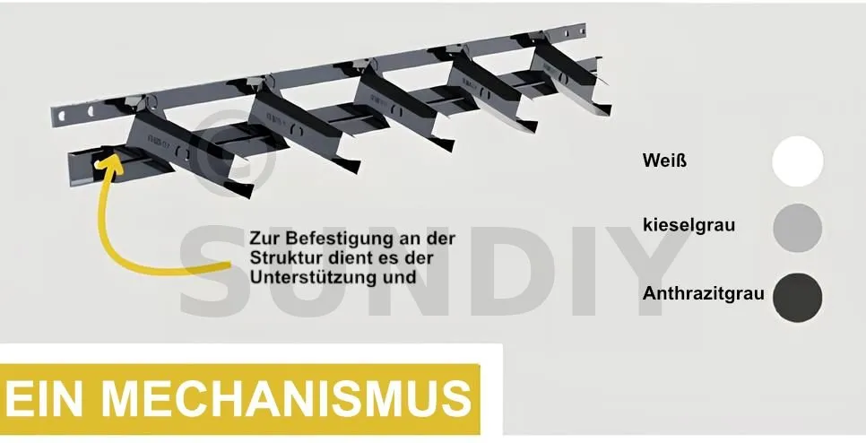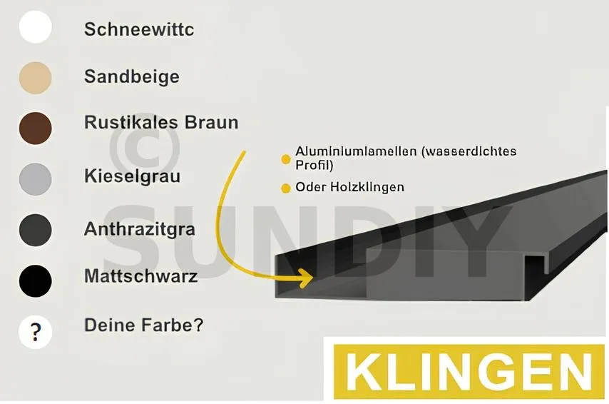 SUNDIY – der Bausatz mit verstellbaren Lamellen – ist eine innovative und anpassbare Lösung zur Gestaltung maßgeschneiderter Sichtschutzelemente. Dank seines Aluminium-Mechanismus ist er einfach zu befestigen und zu montieren. Der SUNDIY-Bausatz bietet außergewöhnliche Vielseitigkeit – mit Lamellen aus Holz (Douglasie) oder Aluminium in verschiedenen Farben wie Weiß, Kieselgrau oder Anthrazitgrau. Auch der Mechanismus selbst ist in diesen Farben erhältlich. Ob Einsteiger oder erfahrener Heimwerker – SUNDIY lässt sich leicht montieren und schützt effektiv Ihre Privatsphäre, während er Ihrem Außenbereich eine ästhetische Note verleiht!