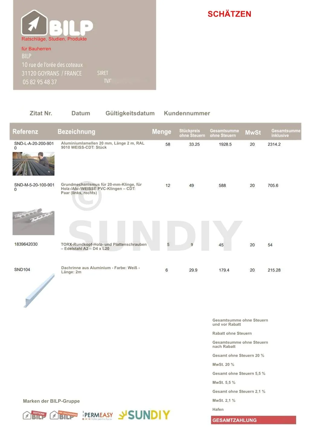 Sie erhalten detaillierte Angebote, die Ihnen eine klare und präzise Vorstellung von Ihrem Projekt bieten. Jedes Angebot spielt eine spezifische Rolle: eines ist der Struktur gewidmet, falls erforderlich, und ein weiteres konzentriert sich auf die Ausstattung (Lamellen, Mechanismen, etc.). Dieser Ansatz ermöglicht Ihnen eine bessere Übersicht über das Gesamtbudget und erleichtert fundierte Entscheidungen.
