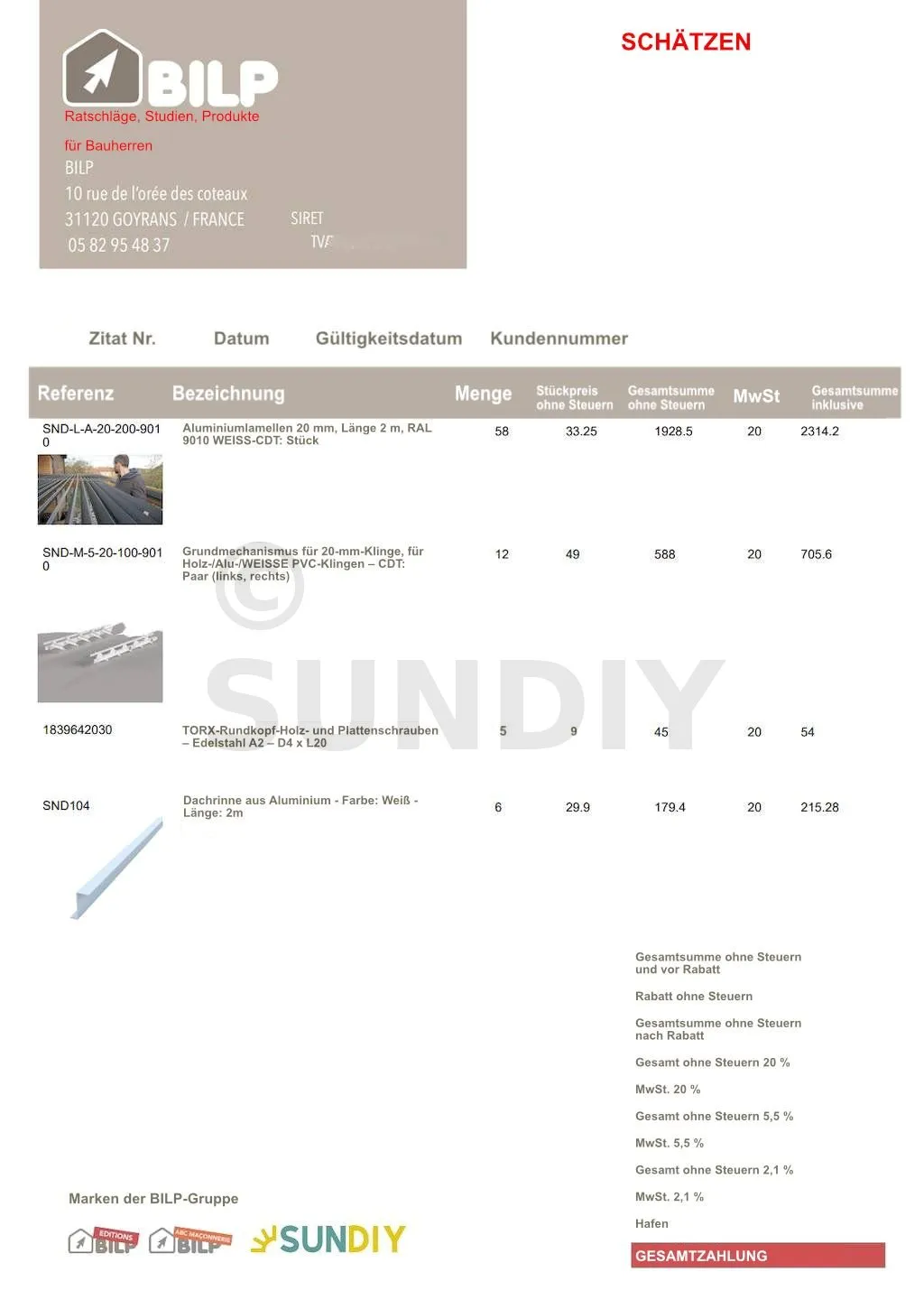 Sie erhalten detaillierte Angebote, die Ihnen einen klaren und präzisen Überblick über Ihr Projekt geben. Jeder Posten hat eine klar definierte Rolle: einer betrifft die Konstruktion, bei Bedarf ein weiterer die Ausstattung (Lamellen/Mechanismen usw.). So behalten Sie das Gesamtbudget besser im Blick und können fundierte Entscheidungen treffen.